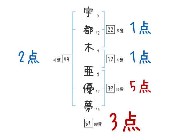 総運![]() | 宇都木亜優夢さんの総運は61画の3つ星!強情な性格でうぬぼれタイプ。自ら破滅する。 あなたの人生を表す1番重要な運勢です。生涯を通じて影響する総合運となり、主に50歳以降の晩年期に影響を及ぼします。 |