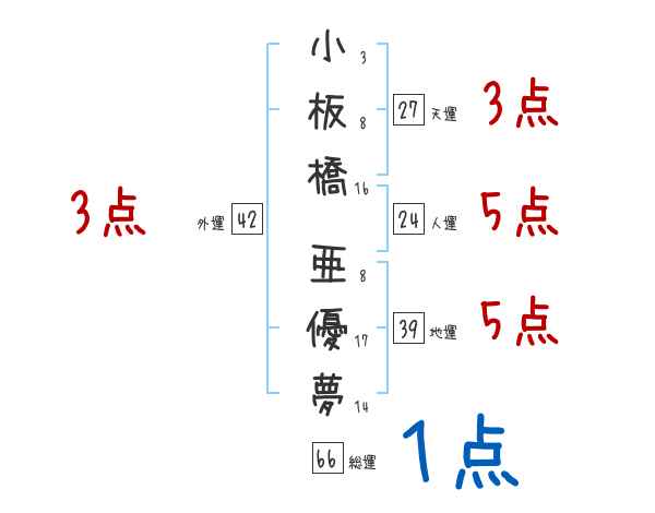 総運![]() | 小板橋亜優夢さんの総運は66画の1つ星!迷うことが多く挫折しやすい傾向が。辛抱強く物事に取り組みましょう。 あなたの人生を表す1番重要な運勢です。生涯を通じて影響する総合運となり、主に50歳以降の晩年期に影響を及ぼします。 |