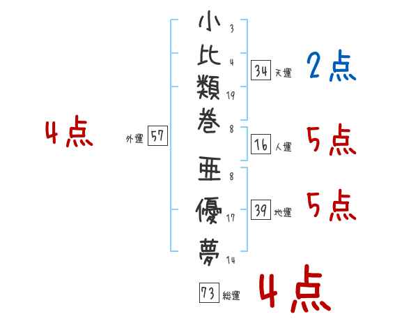 人運![]() | 小比類巻亜優夢さんの人運は16画の5つ星!人望が厚く大きく発展する。逆転成功が見える。 性格や才能などを表す2番目に重要な運勢です。人間関係や協調性、社会的な成功に影響します。主に20歳から50歳ぐらいまでの中年期の運勢を表します。 |