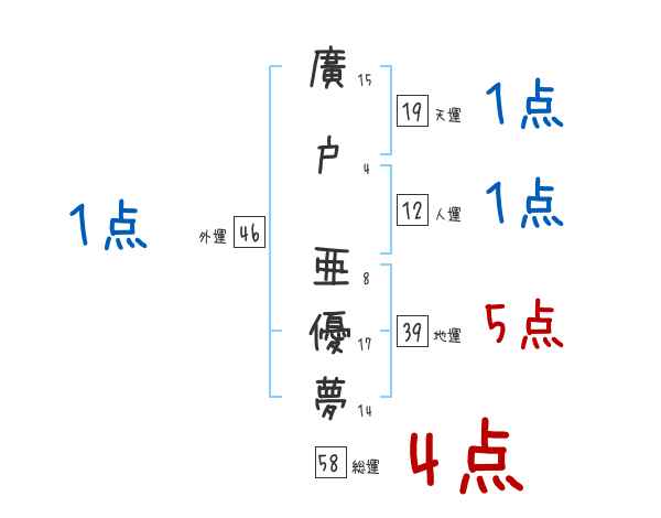 天運![]() | 廣戸亜優夢さんの天運は19画の1つ星!優れた才能を持ちますが、協調性が足りないことも。周りの人と協力する事を意識しましょう。 家系が持つ宿命的な運勢を表します。祖先から受け継いだ苗字ですので自分の力が及びません。家柄を象徴します。 |