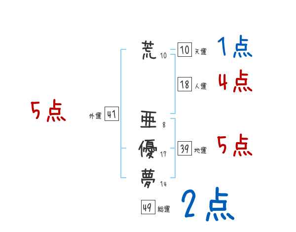 地運![]() | 荒亜優夢さんの地運は39画の5つ星!社交性に優れ人望が厚い。人の上に立ち成功する。 個性を表す基礎的な運勢です。性格形成や対人関係、行動力など家庭環境に影響されます。主に誕生してから20歳くらいまでの若年期の運勢を表します。 |