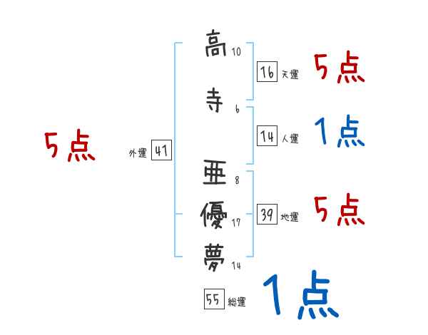 天運![]() | 高寺亜優夢さんの天運は16画の5つ星!人望が厚く大きく発展する。逆転成功が見える。 家系が持つ宿命的な運勢を表します。祖先から受け継いだ苗字ですので自分の力が及びません。家柄を象徴します。 |