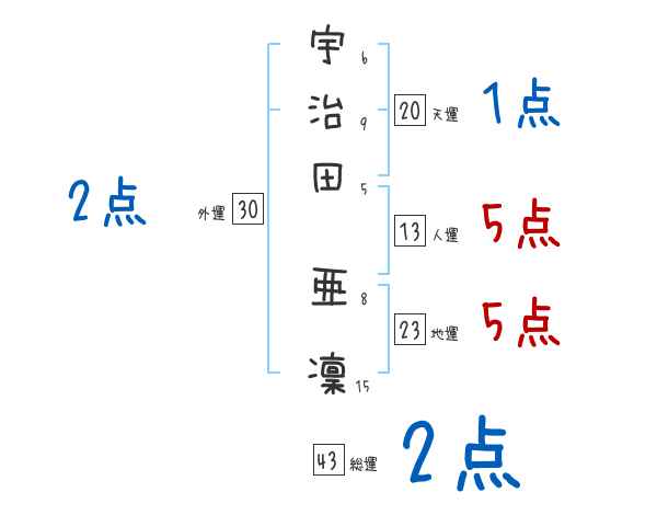 総運![]() | 宇治田亜凜さんの総運は43画の2つ星!頑固な性格で独立心が強いかも。やや非現実的で浪費に注意しましょう。 あなたの人生を表す1番重要な運勢です。生涯を通じて影響する総合運となり、主に50歳以降の晩年期に影響を及ぼします。 |
