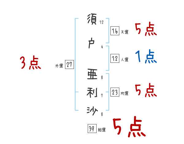 天運![]() | 須戸亜利沙さんの天運は16画の5つ星!人望が厚く大きく発展する。逆転成功が見える。 家系が持つ宿命的な運勢を表します。祖先から受け継いだ苗字ですので自分の力が及びません。家柄を象徴します。 |