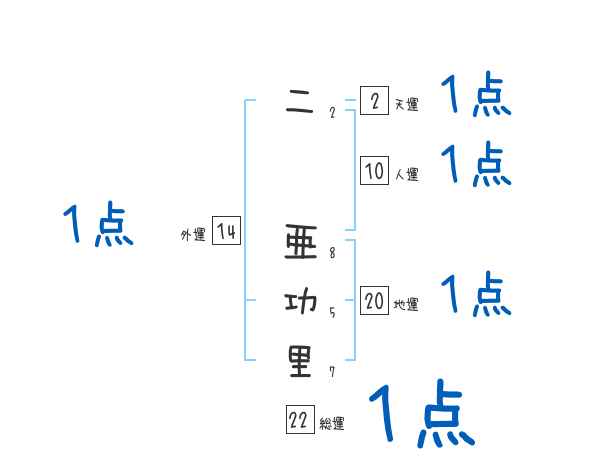 総運![]() | 二亜功里さんの総運は22画の1つ星!努力することが苦手ないっぽう手先が器用。芸術性にも優れる。 あなたの人生を表す1番重要な運勢です。生涯を通じて影響する総合運となり、主に50歳以降の晩年期に影響を及ぼします。 |