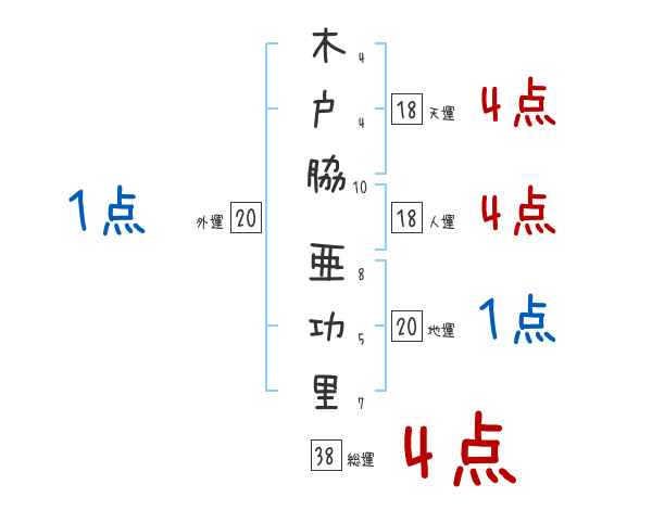 天運![]() | 木戸脇亜功里さんの天運は18画の4つ星!情熱的で剛気。忍耐力があり信頼される。 家系が持つ宿命的な運勢を表します。祖先から受け継いだ苗字ですので自分の力が及びません。家柄を象徴します。 |