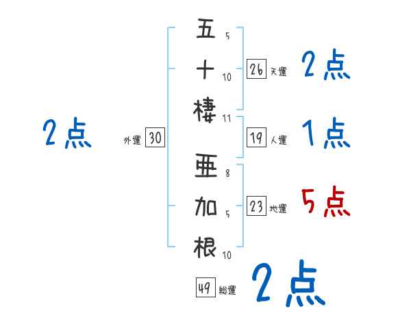 人運![]() | 五十棲亜加根さんの人運は19画の1つ星!優れた才能を持ちますが、協調性が足りないことも。周りの人と協力する事を意識しましょう。 性格や才能などを表す2番目に重要な運勢です。人間関係や協調性、社会的な成功に影響します。主に20歳から50歳ぐらいまでの中年期の運勢を表します。 |