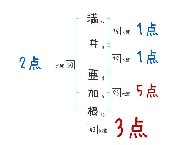 天運![]() | 満井亜加根さんの天運は19画の1つ星!優れた才能を持ちますが、協調性が足りないことも。周りの人と協力する事を意識しましょう。 家系が持つ宿命的な運勢を表します。祖先から受け継いだ苗字ですので自分の力が及びません。家柄を象徴します。 |