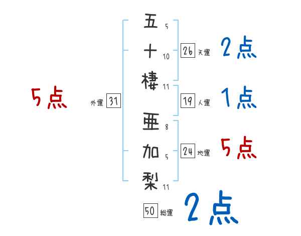 天運![]() | 五十棲亜加梨さんの天運は26画の2つ星!波瀾万丈かも。信頼できる人を大事にしましょう。 家系が持つ宿命的な運勢を表します。祖先から受け継いだ苗字ですので自分の力が及びません。家柄を象徴します。 |
