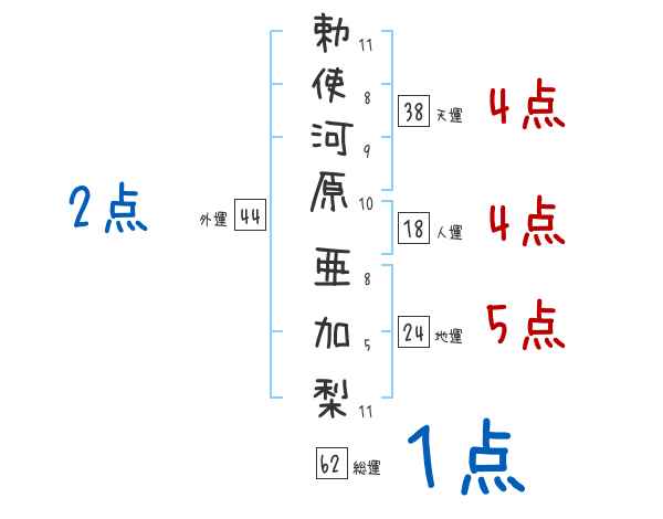 外運![]() | 勅使河原亜加梨さんの外運は44画の2つ星!誠実で慎重な性格。物事を考えすぎないように注意しましょう。 生活面を象徴する運勢です。外部から受ける影響力を表し、結婚運、家庭運や職場、環境への順応性を表します。 |