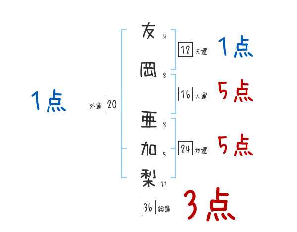 人運![]() | 友岡亜加梨さんの人運は16画の5つ星!人望が厚く大きく発展する。逆転成功が見える。 性格や才能などを表す2番目に重要な運勢です。人間関係や協調性、社会的な成功に影響します。主に20歳から50歳ぐらいまでの中年期の運勢を表します。 |