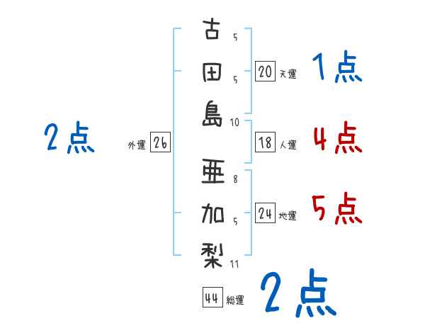 外運![]() | 古田島亜加梨さんの外運は26画の2つ星!波瀾万丈かも。信頼できる人を大事にしましょう。 生活面を象徴する運勢です。外部から受ける影響力を表し、結婚運、家庭運や職場、環境への順応性を表します。 |