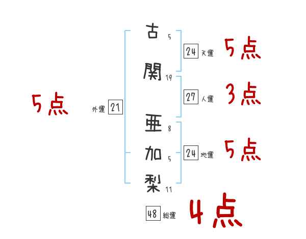 天運![]() | 古関亜加梨さんの天運は24画の5つ星!家庭運が良く順調な人生。金運にも恵まれる。 家系が持つ宿命的な運勢を表します。祖先から受け継いだ苗字ですので自分の力が及びません。家柄を象徴します。 |