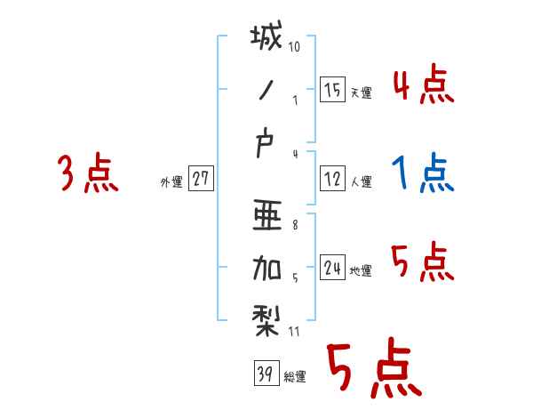 天運![]() | 城ノ戸亜加梨さんの天運は15画の4つ星!人徳があり出世する。順調に物事を進め円満な人生。 家系が持つ宿命的な運勢を表します。祖先から受け継いだ苗字ですので自分の力が及びません。家柄を象徴します。 |