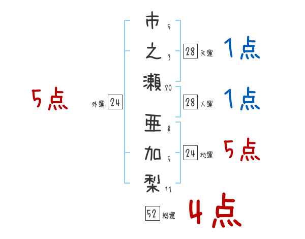 外運![]() | 市之瀬亜加梨さんの外運は24画の5つ星!家庭運が良く順調な人生。金運にも恵まれる。 生活面を象徴する運勢です。外部から受ける影響力を表し、結婚運、家庭運や職場、環境への順応性を表します。 |
