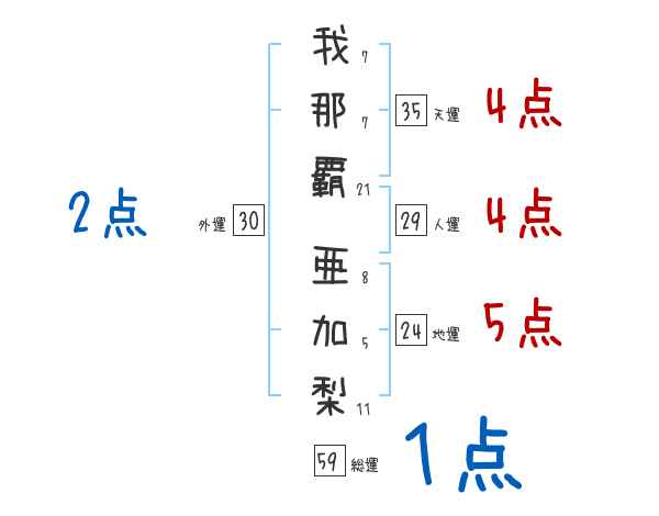 天運![]() | 我那覇亜加梨さんの天運は35画の4つ星!温厚な性格で感受性が高い。穏和な性格で人望が厚い。 家系が持つ宿命的な運勢を表します。祖先から受け継いだ苗字ですので自分の力が及びません。家柄を象徴します。 |