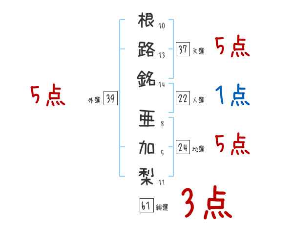 総運![]() | 根路銘亜加梨さんの総運は61画の3つ星!強情な性格でうぬぼれタイプ。自ら破滅する。 あなたの人生を表す1番重要な運勢です。生涯を通じて影響する総合運となり、主に50歳以降の晩年期に影響を及ぼします。 |