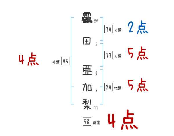 天運![]() | 靏田亜加梨さんの天運は34画の2つ星!独創性に優れるが、自尊心が強く災難に注意しましょう。 家系が持つ宿命的な運勢を表します。祖先から受け継いだ苗字ですので自分の力が及びません。家柄を象徴します。 |