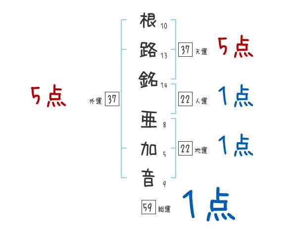 総運![]() | 根路銘亜加音さんの総運は59画の1つ星!意志の弱さであきらめることが多いかも。粘り強さが必要。 あなたの人生を表す1番重要な運勢です。生涯を通じて影響する総合運となり、主に50歳以降の晩年期に影響を及ぼします。 |