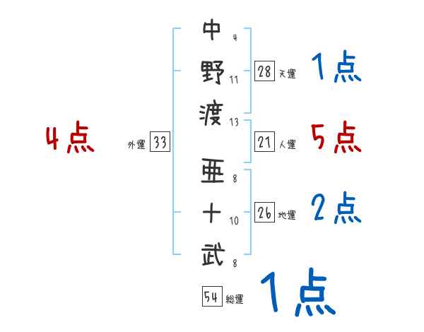 天運![]() | 中野渡亜十武さんの天運は28画の1つ星!家庭環境に注意。スポーツで活躍できる能力があるかも。 家系が持つ宿命的な運勢を表します。祖先から受け継いだ苗字ですので自分の力が及びません。家柄を象徴します。 |