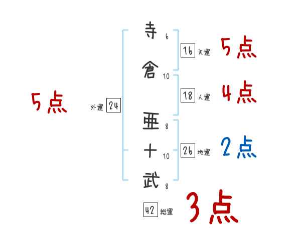天運![]() | 寺倉亜十武さんの天運は16画の5つ星!人望が厚く大きく発展する。逆転成功が見える。 家系が持つ宿命的な運勢を表します。祖先から受け継いだ苗字ですので自分の力が及びません。家柄を象徴します。 |