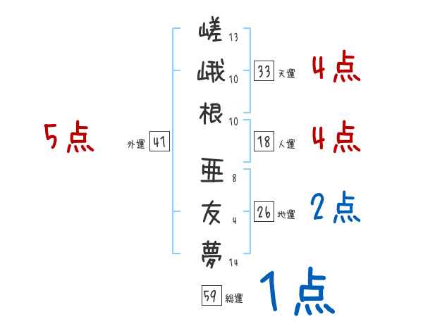 総運![]() | 嵯峨根亜友夢さんの総運は59画の1つ星!意志の弱さであきらめることが多いかも。粘り強さが必要。 あなたの人生を表す1番重要な運勢です。生涯を通じて影響する総合運となり、主に50歳以降の晩年期に影響を及ぼします。 |