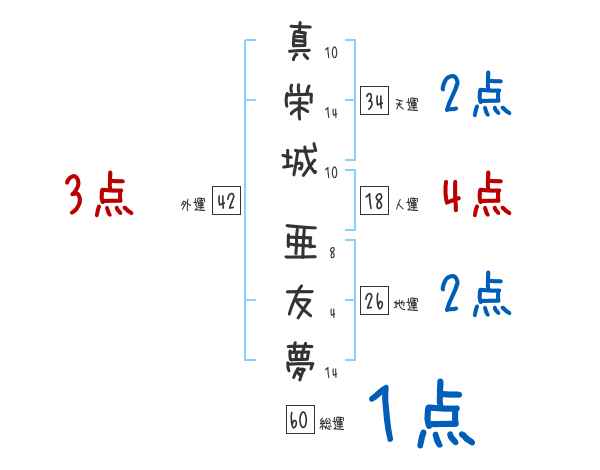 天運![]() | 真栄城亜友夢さんの天運は34画の2つ星!独創性に優れるが、自尊心が強く災難に注意しましょう。 家系が持つ宿命的な運勢を表します。祖先から受け継いだ苗字ですので自分の力が及びません。家柄を象徴します。 |