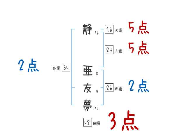 天運![]() | 静亜友夢さんの天運は16画の5つ星!人望が厚く大きく発展する。逆転成功が見える。 家系が持つ宿命的な運勢を表します。祖先から受け継いだ苗字ですので自分の力が及びません。家柄を象徴します。 |