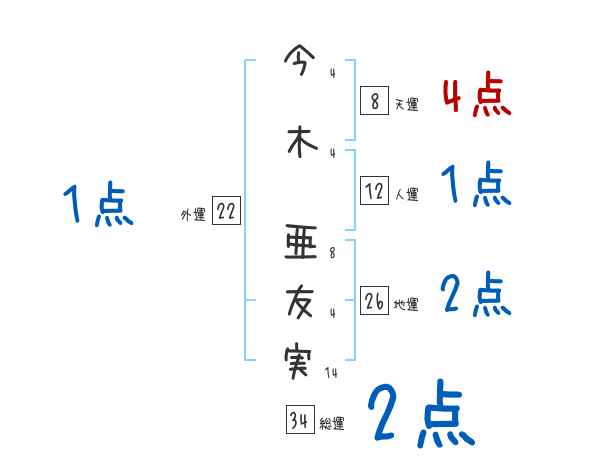 外運![]() | 今木亜友実さんの外運は22画の1つ星!努力することが苦手ないっぽう手先が器用。芸術性にも優れる。 生活面を象徴する運勢です。外部から受ける影響力を表し、結婚運、家庭運や職場、環境への順応性を表します。 |