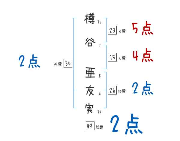 外運![]() | 樽谷亜友実さんの外運は34画の2つ星!独創性に優れるが、自尊心が強く災難に注意しましょう。 生活面を象徴する運勢です。外部から受ける影響力を表し、結婚運、家庭運や職場、環境への順応性を表します。 |