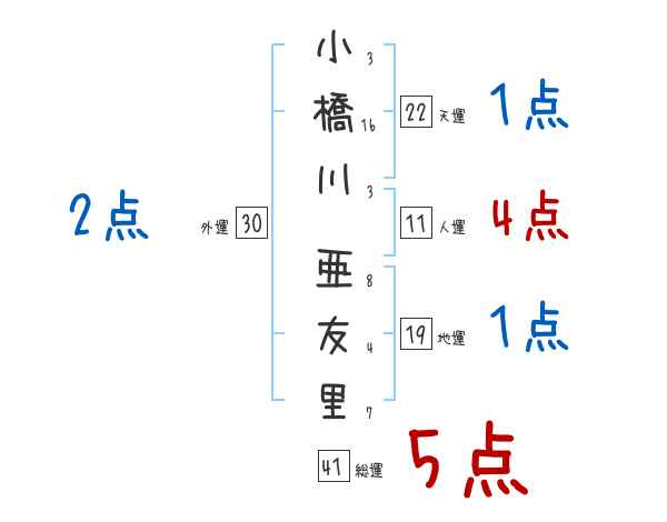 総運![]() | 小橋川亜友里さんの総運は41画の5つ星!大志を抱き、目標に向かって実力を発揮し達成する。温和な性格。 あなたの人生を表す1番重要な運勢です。生涯を通じて影響する総合運となり、主に50歳以降の晩年期に影響を及ぼします。 |