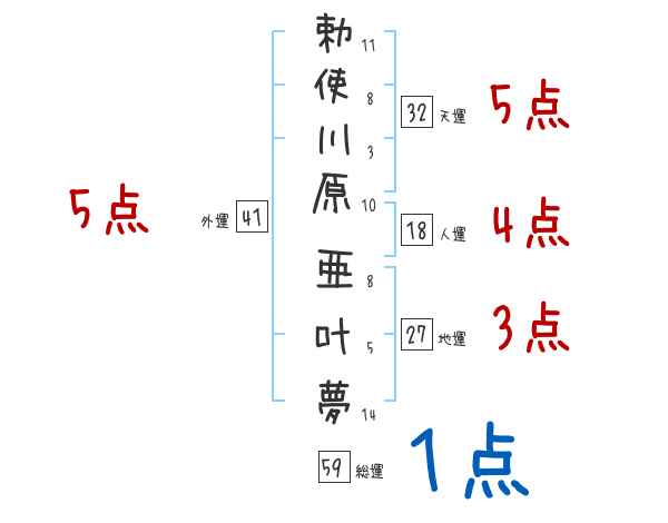 天運![]() | 勅使川原亜叶夢さんの天運は32画の5つ星!柔軟性があり成功する。チャンスが多く金運が良い。 家系が持つ宿命的な運勢を表します。祖先から受け継いだ苗字ですので自分の力が及びません。家柄を象徴します。 |