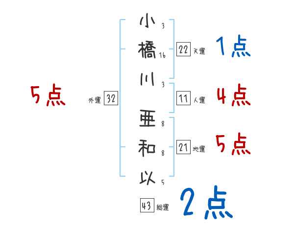 外運![]() | 小橋川亜和以さんの外運は32画の5つ星!柔軟性があり成功する。チャンスが多く金運が良い。 生活面を象徴する運勢です。外部から受ける影響力を表し、結婚運、家庭運や職場、環境への順応性を表します。 |