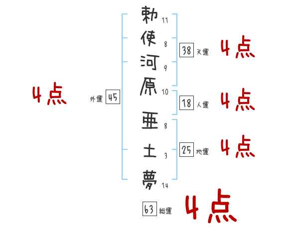 天運![]() | 勅使河原亜土夢さんの天運は38画の4つ星!温厚な性格で技術的な才能を発揮する。職人的な仕事に向いている。 家系が持つ宿命的な運勢を表します。祖先から受け継いだ苗字ですので自分の力が及びません。家柄を象徴します。 |