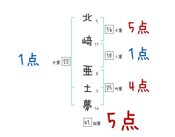 天運![]() | 北﨑亜土夢さんの天運は16画の5つ星!人望が厚く大きく発展する。逆転成功が見える。 家系が持つ宿命的な運勢を表します。祖先から受け継いだ苗字ですので自分の力が及びません。家柄を象徴します。 |