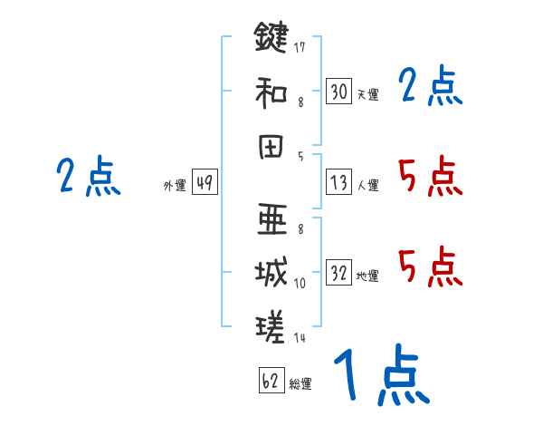 地運![]() | 鍵和田亜城瑳さんの地運は32画の5つ星!柔軟性があり成功する。チャンスが多く金運が良い。 個性を表す基礎的な運勢です。性格形成や対人関係、行動力など家庭環境に影響されます。主に誕生してから20歳くらいまでの若年期の運勢を表します。 |