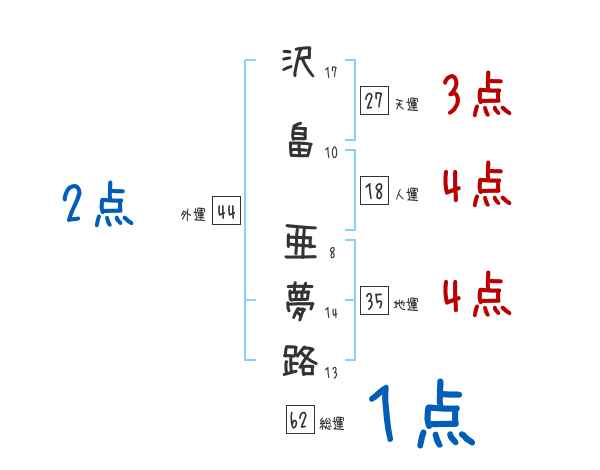 外運![]() | 沢畠亜夢路さんの外運は44画の2つ星!誠実で慎重な性格。物事を考えすぎないように注意しましょう。 生活面を象徴する運勢です。外部から受ける影響力を表し、結婚運、家庭運や職場、環境への順応性を表します。 |