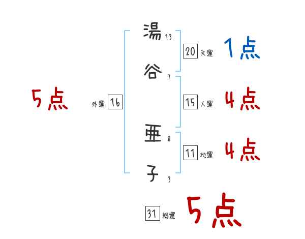 総運![]() | 湯谷亜子さんの総運は31画の5つ星!社交性があり判断力に優れる。順風満帆な人生で円満な生活。 あなたの人生を表す1番重要な運勢です。生涯を通じて影響する総合運となり、主に50歳以降の晩年期に影響を及ぼします。 |