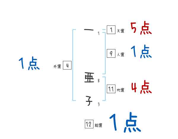 天運![]() | 一亜子さんの天運は1画の5つ星!行動力、指導力があり出世し繁栄する。幸運に恵まれる。 家系が持つ宿命的な運勢を表します。祖先から受け継いだ苗字ですので自分の力が及びません。家柄を象徴します。 |