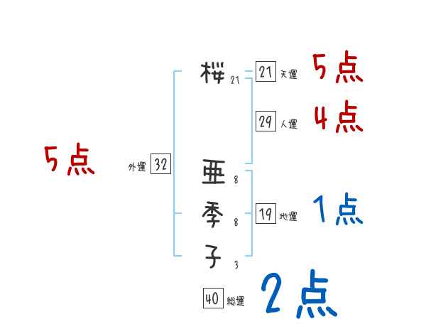 外運![]() | 桜亜季子さんの外運は32画の5つ星!柔軟性があり成功する。チャンスが多く金運が良い。 生活面を象徴する運勢です。外部から受ける影響力を表し、結婚運、家庭運や職場、環境への順応性を表します。 |
