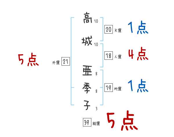 総運![]() | 高城亜季子さんの総運は39画の5つ星!社交性に優れ人望が厚い。人の上に立ち成功する。 あなたの人生を表す1番重要な運勢です。生涯を通じて影響する総合運となり、主に50歳以降の晩年期に影響を及ぼします。 |