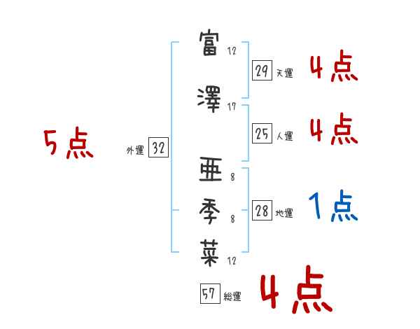 外運![]() | 富澤亜季菜さんの外運は32画の5つ星!柔軟性があり成功する。チャンスが多く金運が良い。 生活面を象徴する運勢です。外部から受ける影響力を表し、結婚運、家庭運や職場、環境への順応性を表します。 |