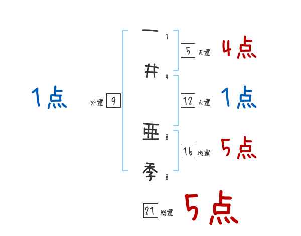 天運![]() | 一井亜季さんの天運は5画の4つ星!健康で安泰。協調性に優れ、財産に恵まれる。 家系が持つ宿命的な運勢を表します。祖先から受け継いだ苗字ですので自分の力が及びません。家柄を象徴します。 |
