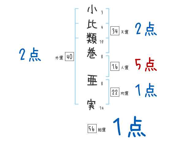 人運![]() | 小比類巻亜実さんの人運は16画の5つ星!人望が厚く大きく発展する。逆転成功が見える。 性格や才能などを表す2番目に重要な運勢です。人間関係や協調性、社会的な成功に影響します。主に20歳から50歳ぐらいまでの中年期の運勢を表します。 |