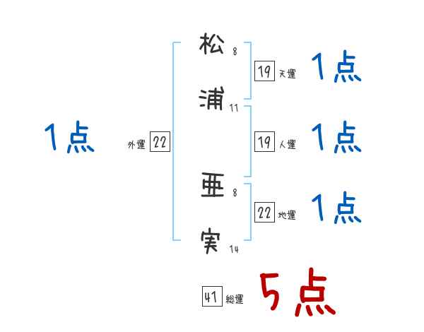 | 外運  | 松浦亜実さんの外運は22画の1つ星!努力することが苦手ないっぽう手先が器用。芸術性にも優れる。生活面を象徴する運勢です。外部から受ける影響力を表し、結婚運、家庭運や職場、環境への順応性を表します。 |
