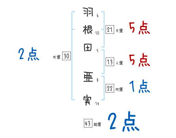 総運![]() | 羽根田亜実さんの総運は43画の2つ星!頑固な性格で独立心が強いかも。やや非現実的で浪費に注意しましょう。 あなたの人生を表す1番重要な運勢です。生涯を通じて影響する総合運となり、主に50歳以降の晩年期に影響を及ぼします。 |