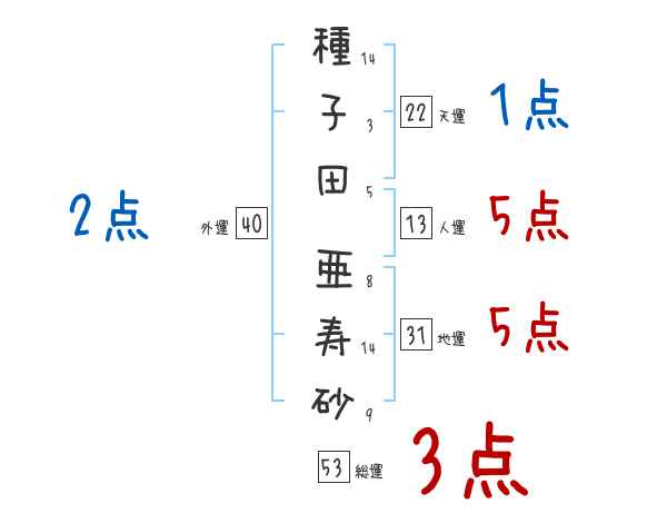 天運![]() | 種子田亜寿砂さんの天運は22画の1つ星!努力することが苦手ないっぽう手先が器用。芸術性にも優れる。 家系が持つ宿命的な運勢を表します。祖先から受け継いだ苗字ですので自分の力が及びません。家柄を象徴します。 |