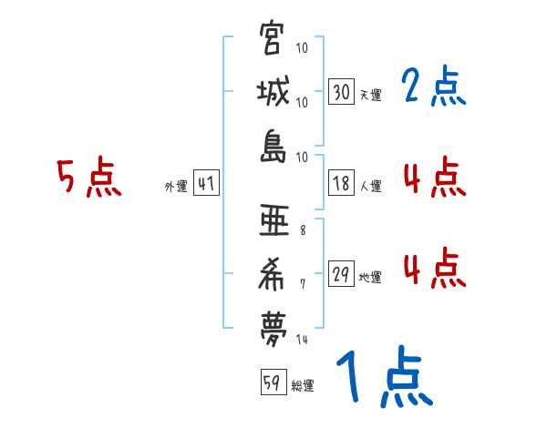 総運![]() | 宮城島亜希夢さんの総運は59画の1つ星!意志の弱さであきらめることが多いかも。粘り強さが必要。 あなたの人生を表す1番重要な運勢です。生涯を通じて影響する総合運となり、主に50歳以降の晩年期に影響を及ぼします。 |