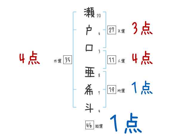 総運![]() | 瀬戸口亜希斗さんの総運は46画の1つ星!迷走することが多く苦労するかも。目先のことにとらわれないように。 あなたの人生を表す1番重要な運勢です。生涯を通じて影響する総合運となり、主に50歳以降の晩年期に影響を及ぼします。 |