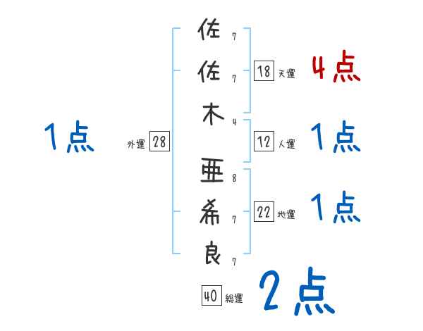 外運![]() | 佐佐木亜希良さんの外運は28画の1つ星!家庭環境に注意。スポーツで活躍できる能力があるかも。 生活面を象徴する運勢です。外部から受ける影響力を表し、結婚運、家庭運や職場、環境への順応性を表します。 |